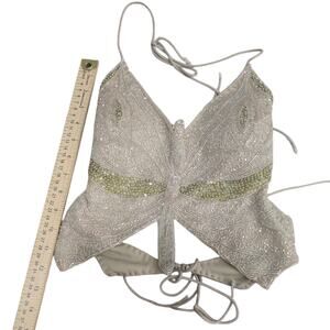 Y2K 5.7.9 Vintage Beaded Sequin Butterfly Halter Top Medium Green Cream