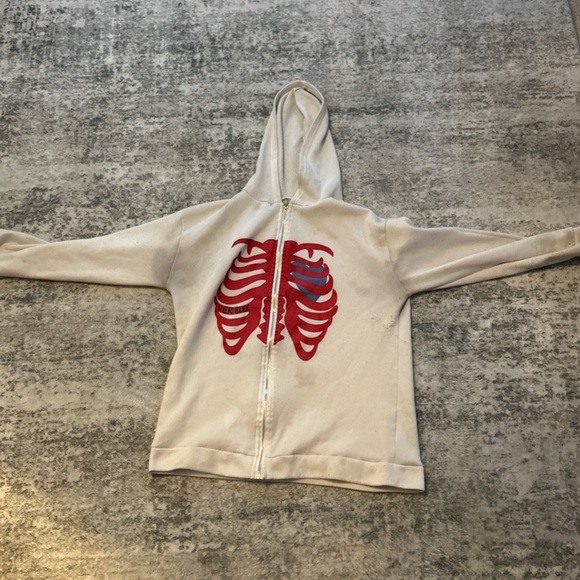 Medium, White Zip-up, designed with red ribcage and a blue heart