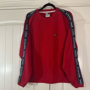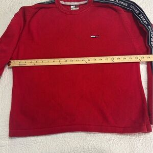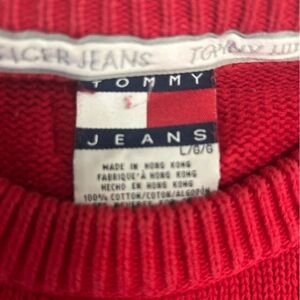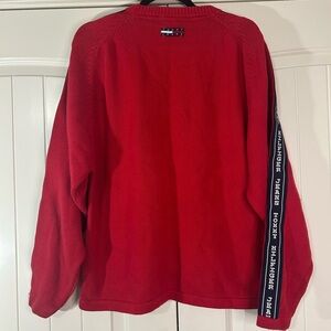 - Red sweater with Navy/White “Tommy Hilfiger” Printed Ribbon down the Sleeves