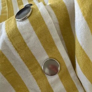 Y2K 90’s Forever 21 mustard and white vertical striped button front midi dress. This dress is so cute! Six fabric straps. Midi length. Snap button closure all the way down the front. Front pockets! Excellent condition. Definitely gives Y2K and 90s vibe. Women’s size small measures approximately 15.5 inches flat across chest from armpit to armpit and 39 inches in length.