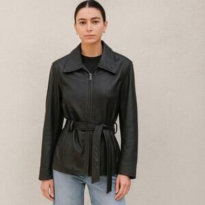 Step into effortless 90s chic with this butter-soft genuine leather jacket. Designed with a timeless minimalist silhouette, it features a sleek zip-up front, structured collar, and an adjustable belted waist for a flattering fit. The supple leather drapes beautifully, giving it that luxe, broken-in softness buyers love.