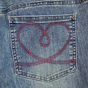 Vintage 1990's jeans by Joe Boxer. These babies have velvet studded floral accents on the legs and embroidered hearts on the back pockets with an overall acid wash coloring. Made with cotton, polyester and spandex for a stretchy and comfortable fit.