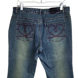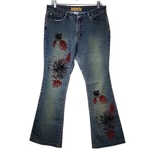 Vintage 1990's jeans by Joe Boxer. These babies have velvet studded floral accents on the legs and embroidered hearts on the back pockets with an overall acid wash coloring. Made with cotton, polyester and spandex for a stretchy and comfortable fit.