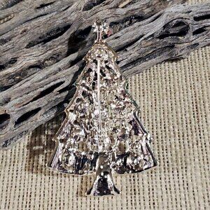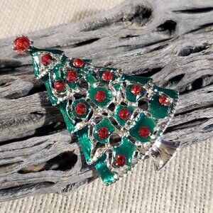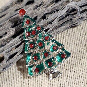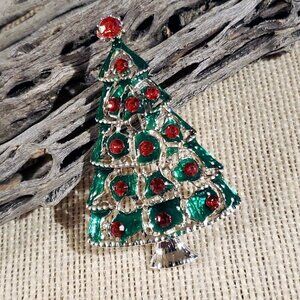 Y2K 90s VintageRed Rhinestone Christmas Tree Enamel Christmas Sweater Pin Brooch