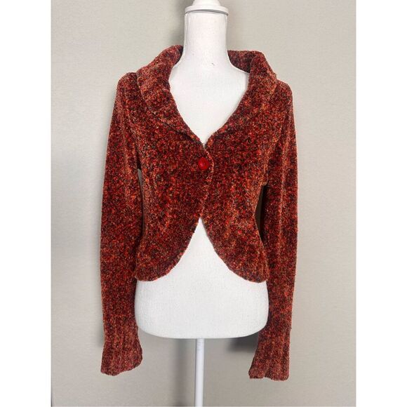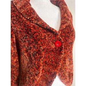 Y2K 90’s Style Multicolor Knitted Cardigan CB Design Medium hole. Beautiful color pattern orange with specs of different colors throughout. Wonderful soft knit there is a hole in the sleeve that could easily be stitched with really any color thread! Such a beautiful sweater very reminiscent of the 90s friends Rachel style!