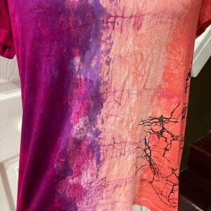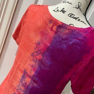 Elevate your wardrobe with the BOHO CHIC ASYMMETRICAL SHIRT, 92 Rayon 8 spandex a distinct piece from the Y2K collection by Art of Cloth. This hand-dyed shirt beautifully blends vibrant shades of purple and orange with unique, artistic patterns. Designed and made in the USA, it offers a one-of-a-kind aesthetic that's both stylish and comfortable. The shirt features a flattering V-neckline, short sleeves, and an asymmetrical hem that adds an extra touch of flair to your look. Crafted from high-quality materials, this shirt ensures durability and a comfortable fit. Perfect for expressing your individuality, it's a versatile addition to any fashion-forward closet.