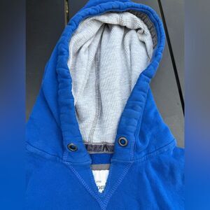 Early 2000s Y2K Abercrombie & Fitch Blue Pullover Hoodie men’s size medium. Fleece interior, F logo emblem on the front, waffle lined hood. Missing drawstrings for hoodie and a tiny hole by the front pocket which can be sewed or patched. No stains. Lots of life left.