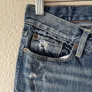 Very good condition- worn pair of jeans with lots of distressing and well loved + taken care of. Please see all photos.