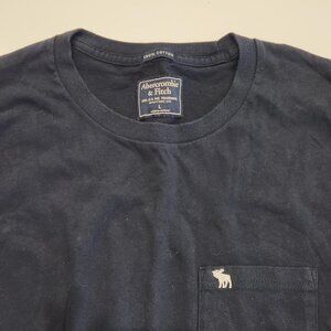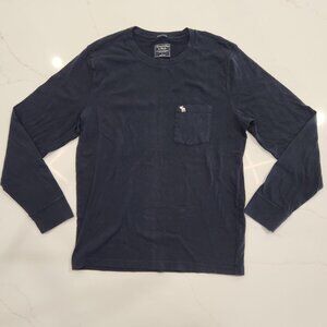 Classic Y2K A&F cotton long-sleeve shirt in navy blue. Comfortable, muscle-fit tee with iconic moose logo on chest pocket