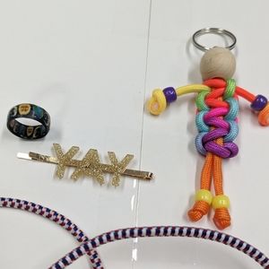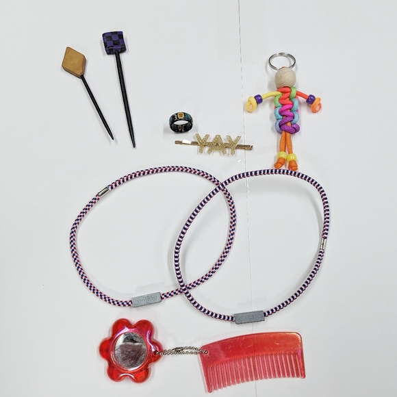 Y2K Accessory Bundle. 8 pieces total, 1 pink mirror/photo frame/comb, 2 American flag elastic necklace/headband with metal indivisible charm, one rainbow knot and pony bead person keychain, one sun earth and moon ring size unknown, one gold plastic yay hair clip, and 2 Handmade clay hair pins.