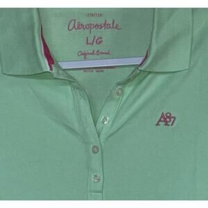 Preppy Y2K Aeropostale A87 polo in pastel green with pink logo embroidery. A timeless retro closet staple with tenniscore and light academia vibes — perfect for casual, sporty, or capsule wardrobe looks.