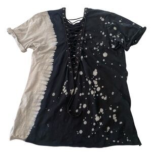 Y2K Affliction Jasmin T-Shirt Cross McBling Lace Up Detail. Features spell out logo with McBling cross, black & white split design with intentional bleach splatter spots, rolled tacked up short sleeves, & lace up back design. Gently preworn with minimal normal wear consistent with age. Size large. Approximate measurements lying flat: PTP: 19” L: 26” Please message me prior to purchasing a bundle. #y2k #affliction #mcbling #grunge #laceup