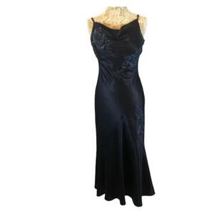 Y2K Alex Evenings navy beaded slip cowl neck floral satin formal Gown small