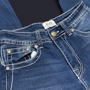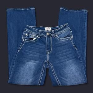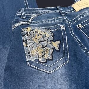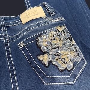 Y2K Angel dark washed denim floral embroidered rhinestone and sequin embellished mid rise flare jeans - Size 5/25, see measurements below!