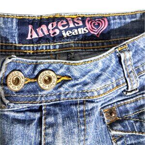 These Angels Jeans denim shorts offer a versatile and casual look for warm weather. Featuring a classic five-pocket style and button closure, they provide comfort and style. The blue denim complements various tops, making it a practical addition to any wardrobe. The size and fabric content tag are removed. The fabric is a blue cotton denim with stretch. Measurements below.