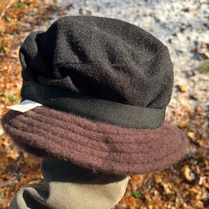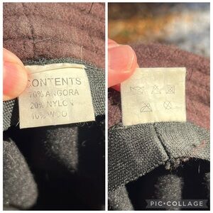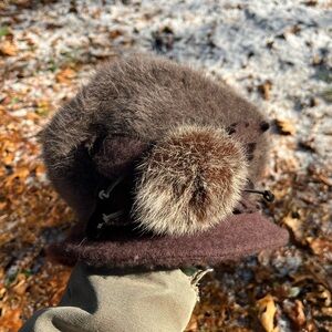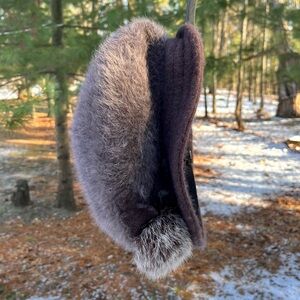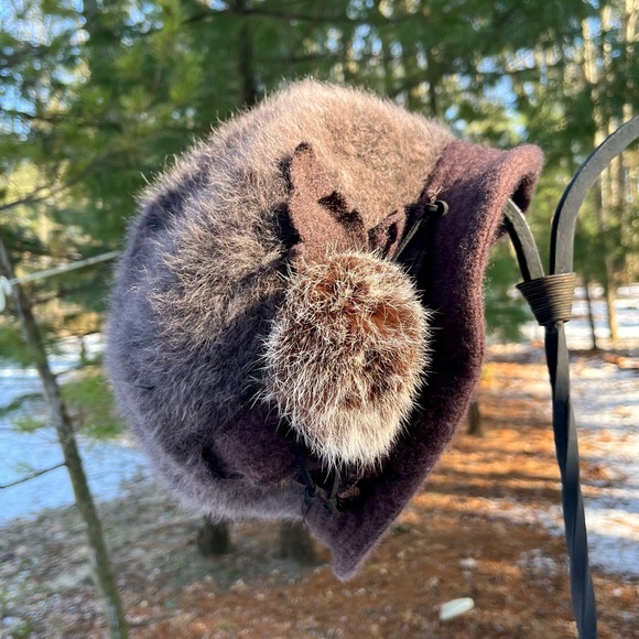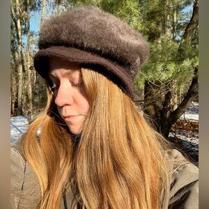 Vintage Y2K knit Angora Rabbit Hair & genuine fur flower hat in brown. So cute! The top part reminds me of a beret, but there’s a brim all the way around as well. Angora, nylon & wool knit hat with a flannel lining to keep you warm. Attached fur flower and felt leaves with leather cord decoration on one side. Fits adult, unisex. I have a big head, and this is too tight on me, but I could get it on for try-on pics. No stretch around head. Please see measurements. In good used condition w/no noticeable flaws besides a slight fur smell & the black facing inside hat was elastic I think, but it’s stretched out. This has been washed by hand to sanitize in cold w/Woolite + hang dry without getting fur flower wet. Ready to wear!
