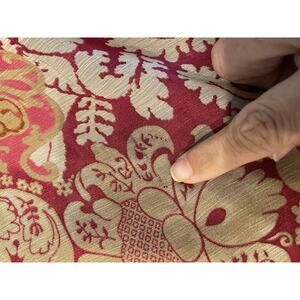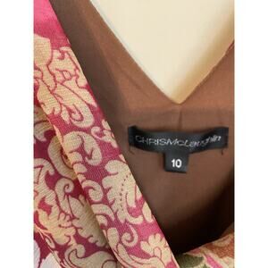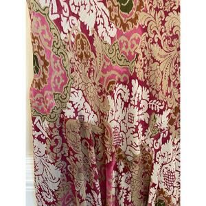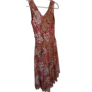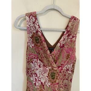 Sleeveless pullover lined dress with a crossover babydoll neckline, asymmetric hemline, asymmetric seaming and construction. Damask print on chiffon in pink, green, brown, tan and white. No holes or stains but there a couple of snags, photographed, would be very hard to notice.