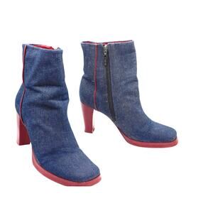 Y2K BCBG Max Azria Demin Women Stack Heel Boots Size 9.5 40 1/2 RARE Red Trim