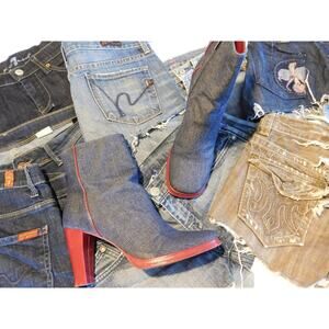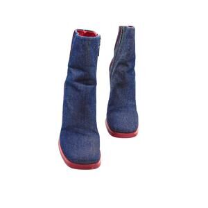 BCBG Max Azria Y2K Demin Women Stack Heel Boots Size 9.5 40 1/2 RARE Red Trim