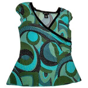 Y2K BCBG MaxAzria Shirt M Faux Wrap Slim Fit Blue Polka Dot Ruffled Cap Sleeve