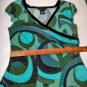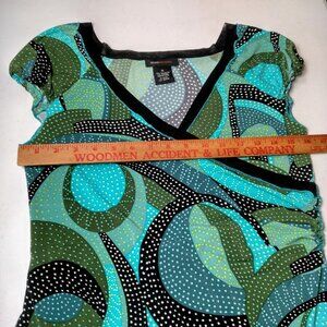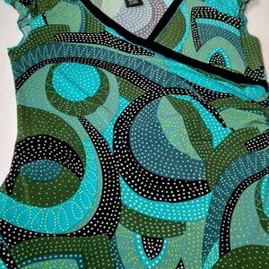 Elevate your wardrobe with the BCBG MaxAzria Faux Wrap Top in a size M, a piece that effortlessly marries modern style with vintage flair. The abstract polka dot pattern and ruffled cap sleeves add a playful yet sophisticated touch, perfect for a range of casual occasions. Crafted from a comfortable blend of polyester and spandex, this top features a stretch fabric that contours to your shape for a flattering slim fit. The top's V-neckline and pullover closure ensure ease of wear, while the machine-washable garment care makes maintenance a breeze. Whether you're out for coffee or meeting friends, this multicolor top, detailed with an artsy theme, is a versatile addition to your junior collection, reflecting a chic and contemporary aesthetic.