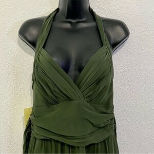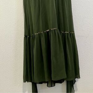 BCBG Maxaria Green 100% Silk Chiffon Boho Sequin Ruched Backless Halter Midi Fit & Flare Dress 10