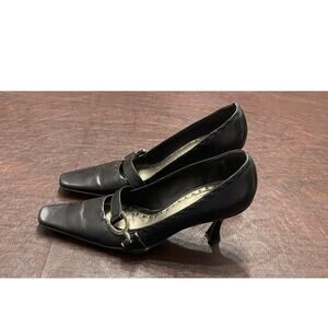Classic early 2000s BCBGirls black leather pumps featuring a sleek square toe, silver horsebit-style buckle strap, and flared 2.5" kitten heel. Feminine and sophisticated with subtle equestrian-inspired detailing — a perfect match for office looks, minimalist styling, or Y2K revival outfits. Some visible wear on the insoles and light creasing to the uppers consistent with age, but overall good pre-owned condition and structurally sound.