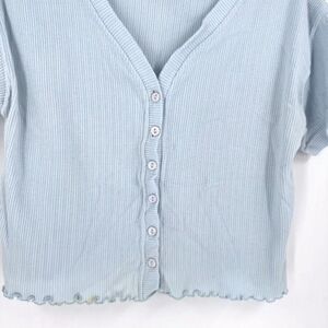 Short sleeve, v neck, button down, Henley style with ribbing and lettuce trim.