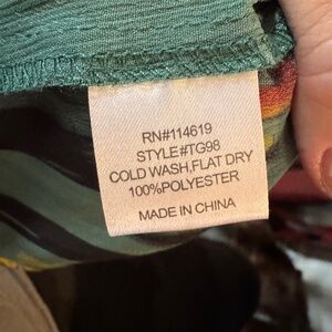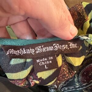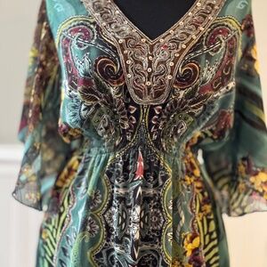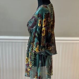 This elegant blouse features a vibrant paisley design with a mix of green, yellow, and brown hues. Perfect for adding a touch of sophistication to any outfit.