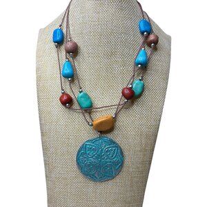 Three strands of cord with saratic stone look beads. Beads look heavy but are lightweight. Finished with large round tin pendant.