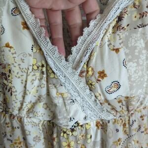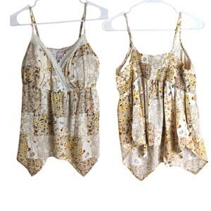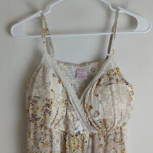 like new! Padded camisole with lace detail at bust smocked back, elastic high waistline, and handkerchief hemline.