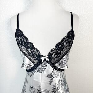 Y2K Babydoll Romantic Black and White Floral Print Lace Trim Chemise Satin Mini Slip Dress Size Large