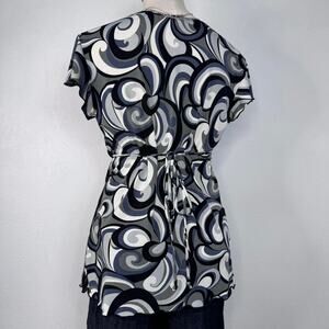swirl print, babydoll style, v-neck, short sleeve, waist tie, vintage-inspired, playful pattern, retro blouse, casual chic, Y2K fashion