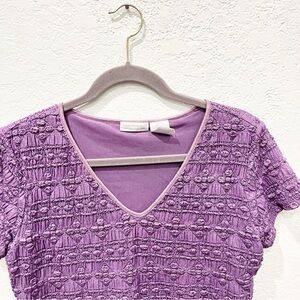 DETAILS: Y2K top women's XL Petite XLP, lavender mesh sheer babytoll cropped top, v neck, short sleeves. Poly spandex, machine wash.