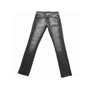 • Low-rise, skinny fit with subtle distressing, whiskering, and black rhinestone accents