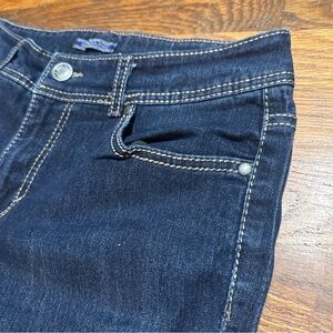 Awesome pair of mid rise dark blue denim stretch straight leg jeans with bedazzled rhinestone and thick stitch design back pockets and contrast stitching. Classic 5-pocket style, zip fly, button closure, dark wash. Pre-owned in very good condition, no holes or stains.