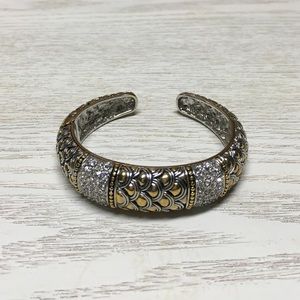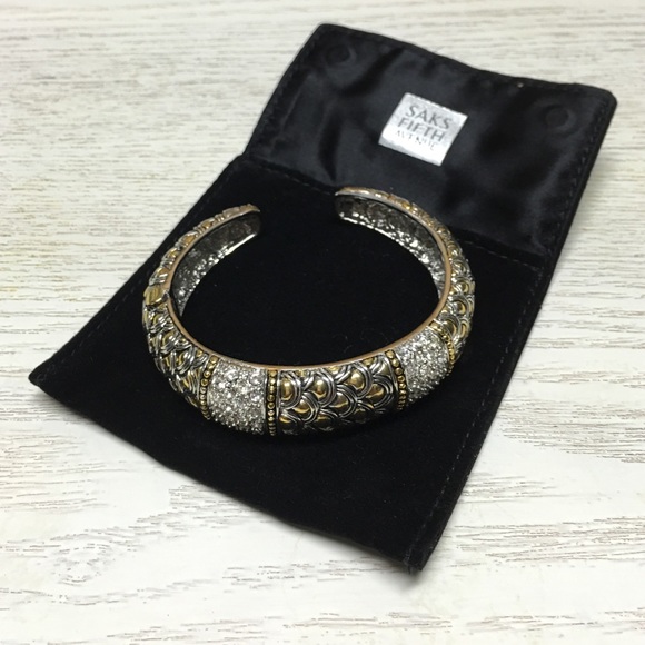Beautiful Y2K era high quality bangle with scallop detail and crystal inlay. Feels and looks great on! Comes in beautiful velour pouch and white Saks Fifth Ave jewelry box. Brand New in box never worn! Perfect gift!