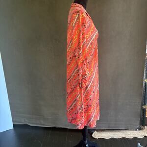 Add bold retro style to your wardrobe with this Barbara Gerwit long sleeve midi dress in vivid coral/orange chain-print. Designed in size XL for a comfortable fit, it features a classic collar, full sleeves, and a flattering shoulder-to-hem length of ~ 40″.