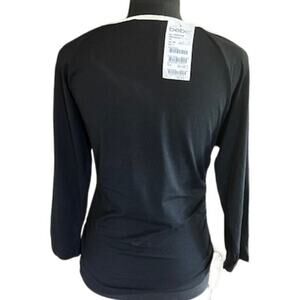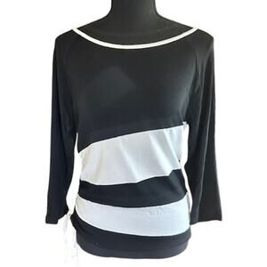 Bebe Wide Boatneck 2-Tone Top – NWT, originally $54. Made in Portugal. Features a bold black and white asymmetrical stripe design with side drawstring ruching and 3/4 sleeves. Style: Wide Boatneck 2 Tone Top.