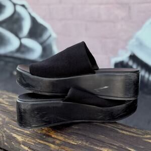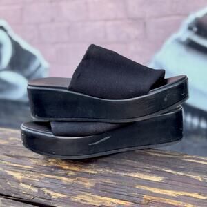 estimated size 10!! front platform 1.5”, rear platform 2.5”, length 10.75” from toe tip to heel. visible scuffs along sides, and some wear to the soles. footbed is clean!