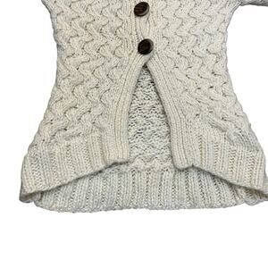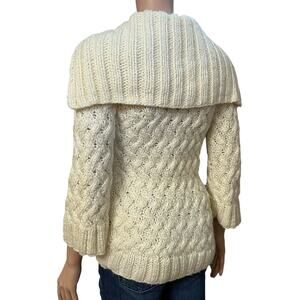 Chunky cable knit fisherman cardigan. Shawl collar. Slim fit. Buttons on top, but the bottom half is meant to be open and doesn’t button.