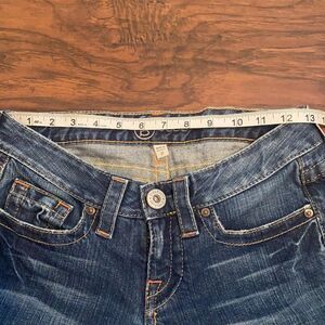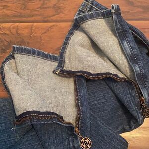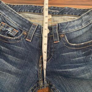 Y2K Bebe Factory Distressed Embellished Bling Denim Cropped Jeans, size 27, factory fading and distressing, zipped at the bottom. Please note: has some wear and missing embellishments.