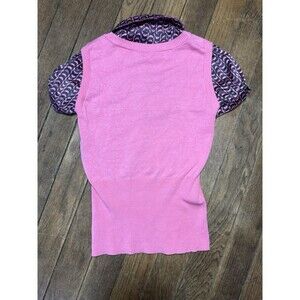 This Bebe silk sweater top in pink from the Y2K era exudes a preppy and business casual office siren charm with its geometric pattern and collared neckline. The slim fit and medium size make it a flattering and comfortable choice for any office setting. The short sleeves and spandex material add a touch of style and flexibility, while the layered accents give it a unique vintage appeal. Perfect for those looking to add a pop of color and character to their wardrobe from the 2000s era.