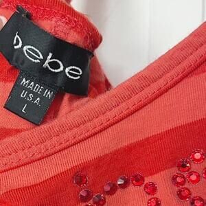 Red and orange y2k 2000s bebe striped cami racerback tank top with red rhinestone crystal brand logo at front.