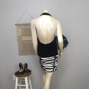 Bebe drop-waist cut mini dress. The top is a soft cotton, backless, cowl neck, halter. The skirt is all sequined, arranged in a wide zebra print and cut as a short, tight mini. The material has some stretch. Size XS, but runs big, more Ike a small/medium. Gently worn no flaws. C35