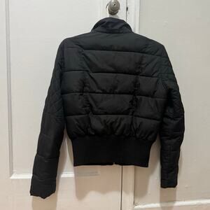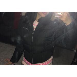 Y2K Bebe size medium black cropped puffer jacket missing fur Rhinestone logo