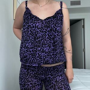 Betsy Johnson intimates two piece set!! Y2K iconic set. Purple leopard. fabric is pretty thin, slight wear. Low rise capri bottoms! Top has little tie front. Size small!