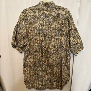 Stand out with this bold Big Dogs short-sleeve button-down shirt featuring an allover tribal-style geometric pattern and repeating Big Dogs St. Bernard logo. Made from soft, breathable 100% cotton, this men’s size large shirt is perfect for casual wear, beach days, or vintage streetwear looks. The retro tribal grid pattern in tan, green, and navy gives it a strong ‘90s/Y2K vibe that's highly collectible.