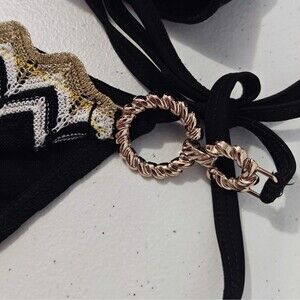Y2K Bikini Swimsuit Crochet Pushup Bra 8 Top 6 String Small S Black Gold Mobwife