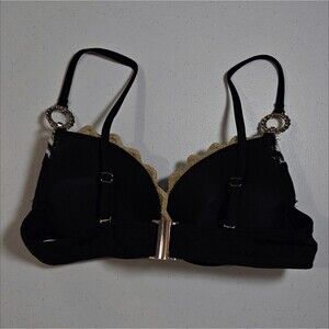 Resort Y2K Bikini Crochet Pushup Bra 8 Top with 6 String Bottoms in Small size is a stylish and trendy swimwear option for women. Featuring a black color with gold metal accents, this two-piece bikini set includes a underwire pushup bra with adjustable straps and a matching string bottom. Missing material and care tag, overall good condition. Noticeable fabric softener scent.